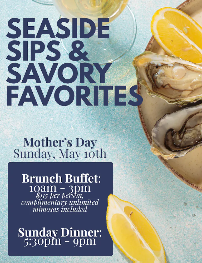 Oystercatchers invites you to celebrate Mother's Day with an elevated coastal brunch on May 10th, 2026. Guests will enjoy a curated selection of fresh‑shucked oysters, chilled seafood, rotating live stations, brunch classics, and decadent desserts. The holiday menu also features signature carving stations prepared by our culinary team.
