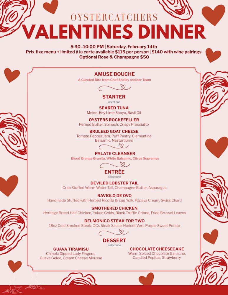 This Valentines Day at Oystercatchers, treat your special someone with an unforgettable evening where love and exquisite cuisine meet by the water. Join us for a beautiful, crafted menu featuring the freshest seafood, decadent dishes, and a selection of wines to complement the evening. Let the ambiance of soft candlelight, breathtaking views, and warm service create the perfect backdrop for a night to remember.