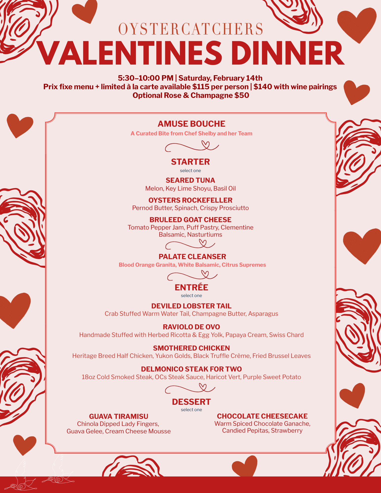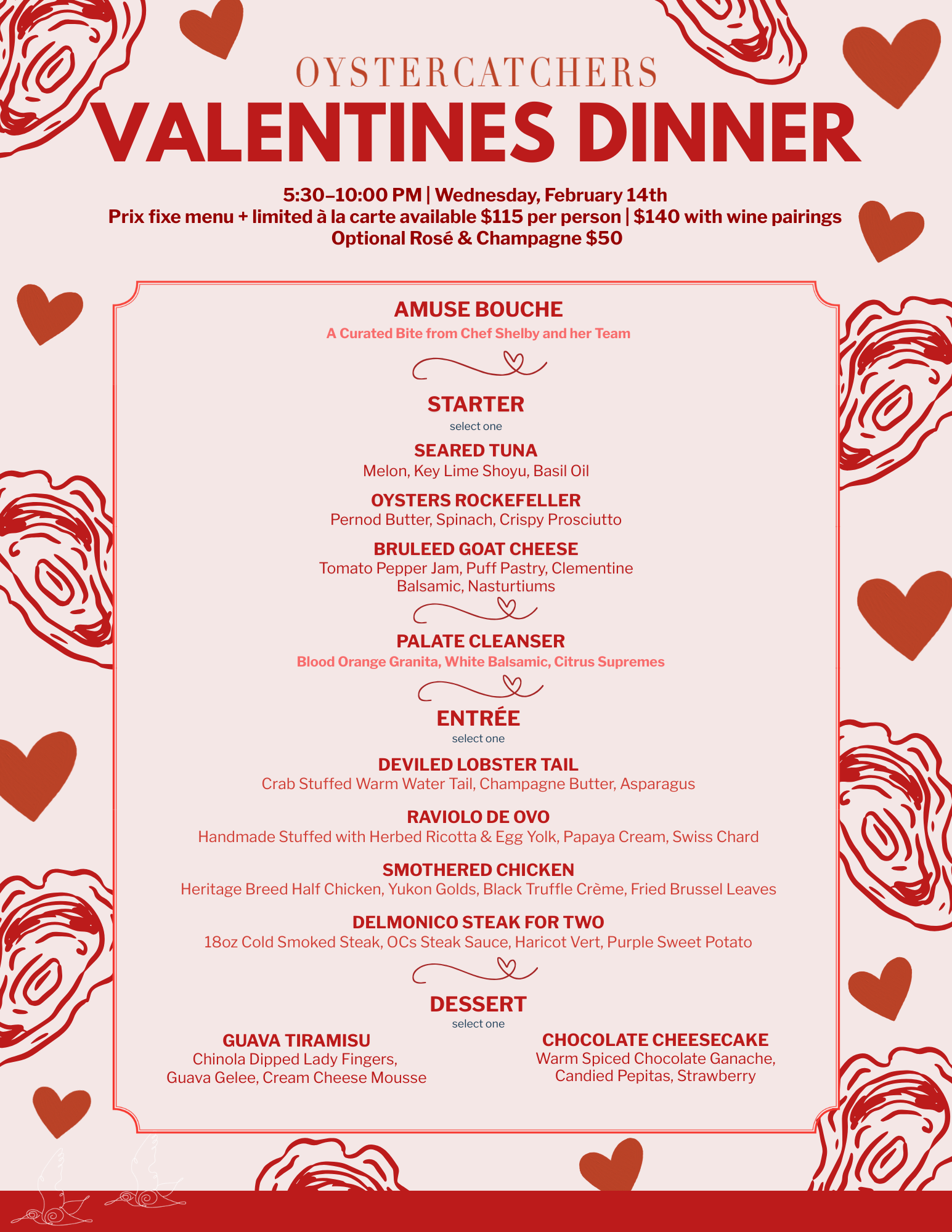This Valentines Day at Oystercatchers, treat your special someone with an unforgettable evening where love and exquisite cuisine meet by the water. Join us for a beautiful, crafted menu featuring the freshest seafood, decadent dishes, and a selection of wines to complement the evening. Let the ambiance of soft candlelight, breathtaking views, and warm service create the perfect backdrop for a night to remember.